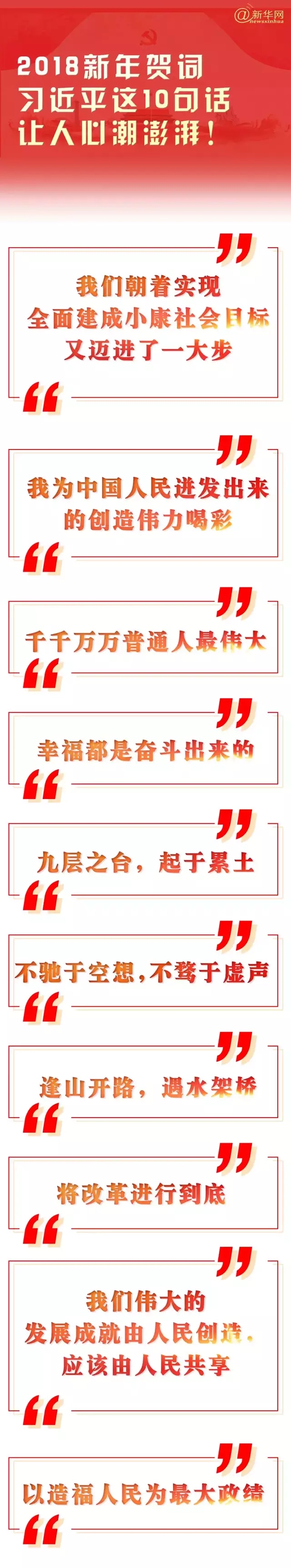 一个大国要稳定,要发展,其中涉及到国际国内方方面面,无论宏观的眼界与格局,亦或微观的某项具体政策,这都需要许许多多人的不断努力。而这篇新年贺词本身,也提到了大家关心的很多事情,既有文雅的引用,也有接地气的大白话,很值得大家学习。贺词里有哪些亮点金句呢?别担心,@新华网 已经提炼出了这10句话……