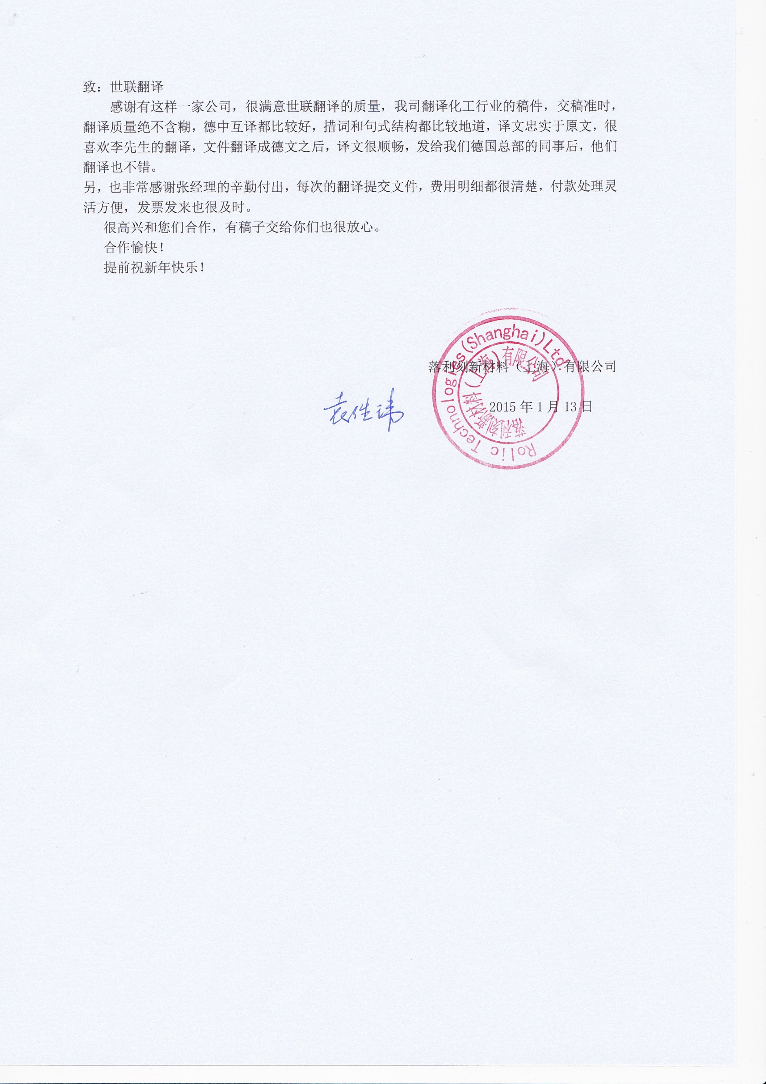 • “在这5年中,世联翻译公司人员对工作的认真、负责、热情、周到深深的打动了我。不仅译件质量好,交稿时间及时,还能在我司资金周转紧张时给予体谅。”