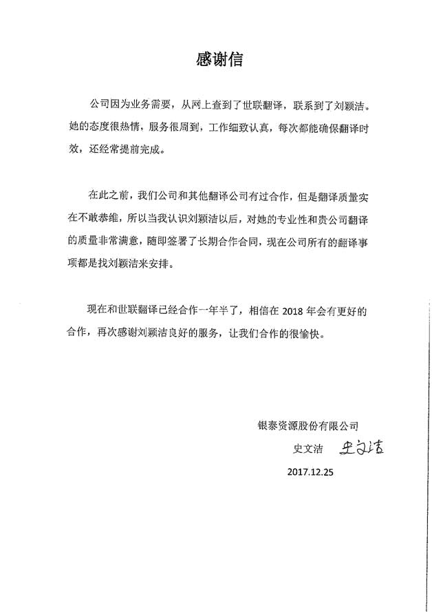 现在和世联翻译已经合作 年 半了, 相信在 2018 年会有更好的合作,再次感谢刘颖洁良好的服务,让我们合作的很愉快。Unitrans世联翻译公司在您身边,离您近的翻译公司,心贴心的专业服务,专业的全球语言翻译与信息解决方案供应商,专业翻译机构品牌。无论在本地,国内还是海外,我们的专业、星级体贴服务,为您的事业加速!世联翻译公司在北京、上海、深圳等国际交往城市设有翻译基地,业务覆盖全国城市。每天有近百万字节的信息和贸易通过世联走向全球!积累了大量政商用户数据,翻译人才库数据,多语种语料库大数据。世联品牌和服务品质已得到政务防务和国际组织、跨国公司和大中型企业等近万用户的认可。 专业翻译公司,北京翻译公司,上海翻译公司,英文翻译,日文翻译,韩语翻译,翻译公司排行榜,翻译公司收费价格表,翻译公司收费标准,翻译公司北京,翻译公司上海。