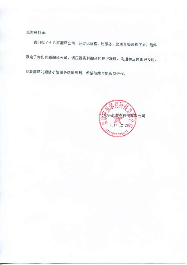 北京宇泉泰克科技有限公司致世联翻译一封信