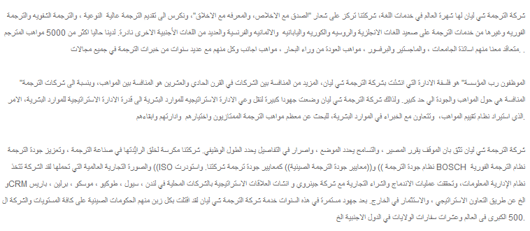 شركة الترجمة شي ليان لها شهرة العالم في خدمات اللغة، شركتنا تركز على شعار "الصدق مع الاخلاص، والمعرفه مع الاخلاق"، ونكرس الى تقديم الترجمة عالية النوعية ، والترجمة الشفويه والترجمة الفوريه وغيرها من خدمات الترجمة على صعيد اللغات الانجلزية والروسيه والكوريه واليابانيه والالمانيه والفرنسية والعديد من اللغات الأجنبية الاخرى نادرة. لدينا حاليا اكثر من 5000 مواهب المترجم متعاقد معنا منهم اساتذة الجامعات ، والماجستير والبرفسور ، مواهب العودة من وراء البحار ، مواهب اجانب وكل منهم مع عديد سنوات من خبرات الترجمة في جميع مجالات. .