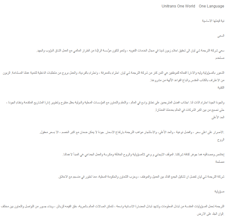 الترجمة تحمل المسؤوليات المقدسة من تبادل المعلومات وتشهد تبادل الحضارة الانسانية واسعة ، تتمكن اتصالات العالم بالحرية، خلق القيمه للزبائن ، وبناء جسور من التواصل والتعاون بين مختلف الوان الجلد على الارض .