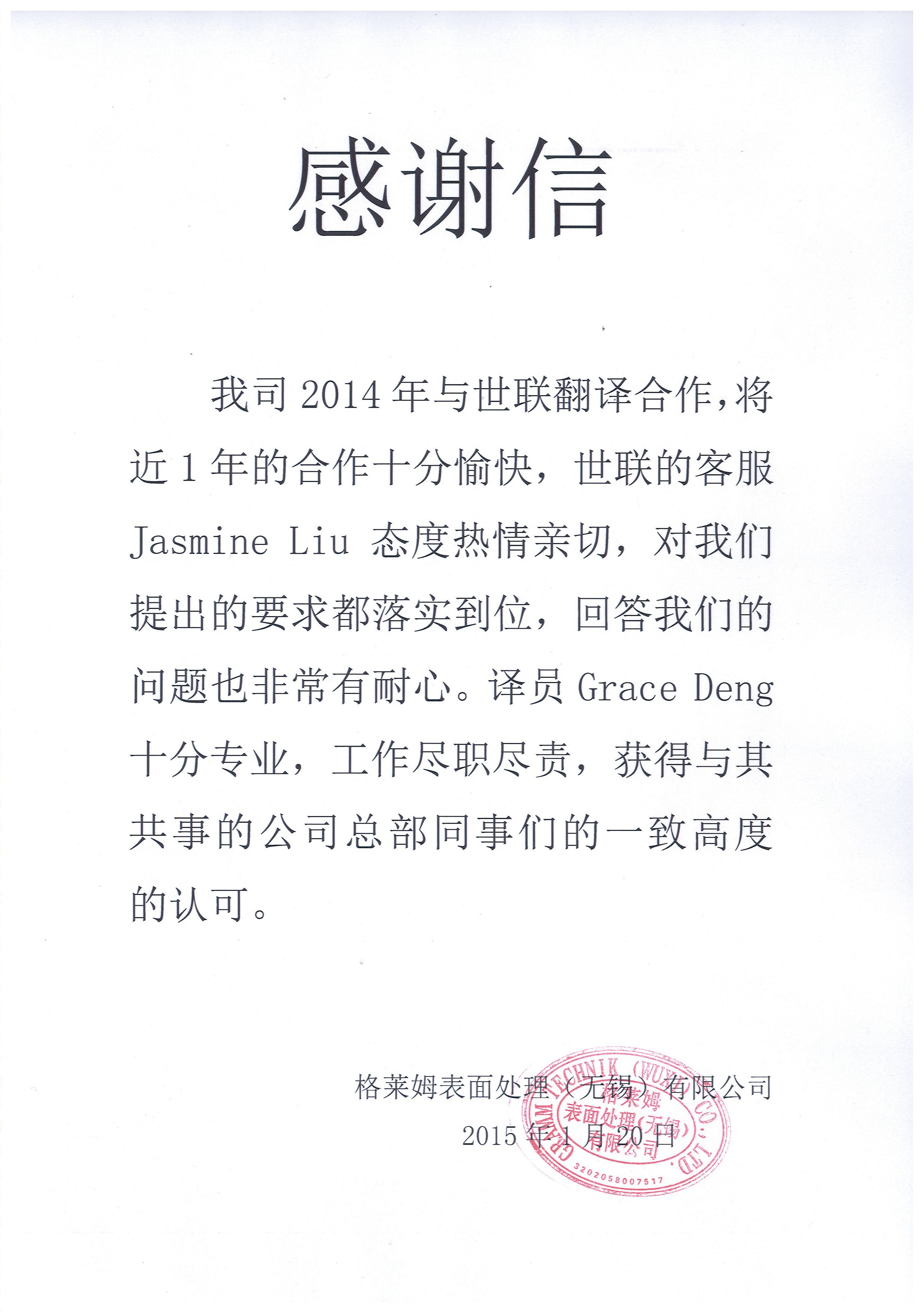 • “我司在2014年与贵公司建立合作关系,贵公司的翻译服务质量高、速度快、态度好,赢得了我司各部门的一致好评。贵司经理工作认真踏实,特此致以诚挚的感谢!”