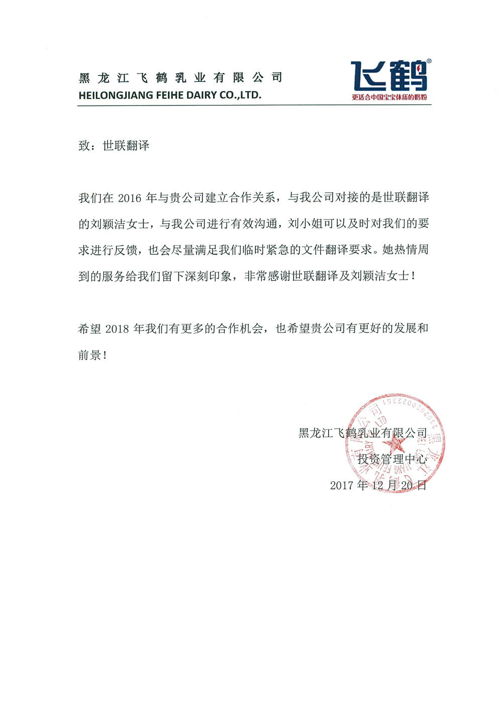 黑龙江飞鹤乳业有限公司致世联翻译的一封信